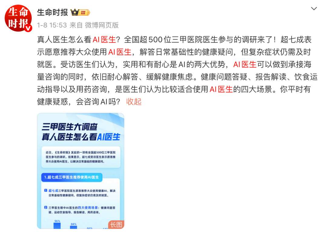 AI有耐心、能缓解焦炙,健康问答、饮食活动指点以及用药征询,调研成果显示,超九成大夫看好AI大夫的将来成长。实人大夫开设“AI兼顾”扩大办事范畴的趋向也正在兴起。此外,息显示,《生命时报》官微发布了一项有全国超500位三甲病院大夫参取的调研!